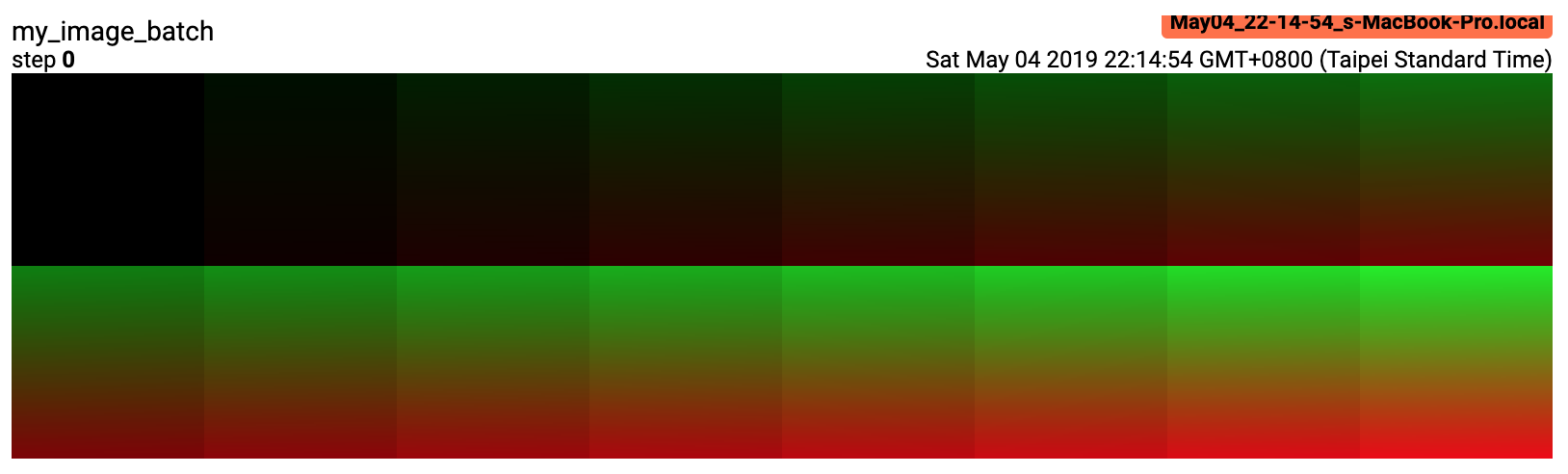 from torch.utils.tensorboard import SummaryWriter import numpy as np img_batch = np.zeros((16, 3, 100, 100)) for i in range(16): img_batch[i, 0] = np.arange(0, 10000).reshape(100, 100) / 10000 / 16 * i img_batch[i, 1] = (1 - np.arange(0, 10000).reshape(100, 100) / 10000) / 16 * i writer = SummaryWriter() writer.add_images('my_image_batch', img_batch, 0) writer.close()