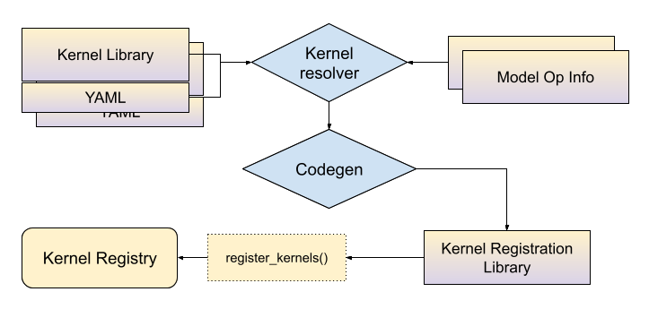 At build time, the yaml files associated with kernel libraries will be passed to the kernel resolver along with the model op info (see selective build doc) and the outcome is a mapping between a combination of operator names and tensor metadata, to kernel symbols. Then codegen tools will use this mapping to generate C++ bindings that connect the kernels to ExecuTorch runtime. ExecuTorch users need to link this generated library into their application to use these kernels.